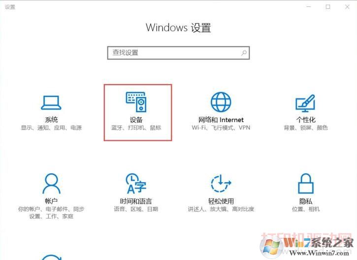 2、在Windows設置窗窗口中找到“設備”項并點擊(此項包含了藍牙,打印機,鼠標的設置);
