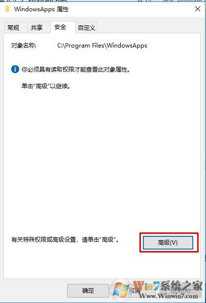 1、首先右鍵點(diǎn)擊WindowsApps文件夾,然后來到安全選項(xiàng)卡,點(diǎn)擊高級按鈕;