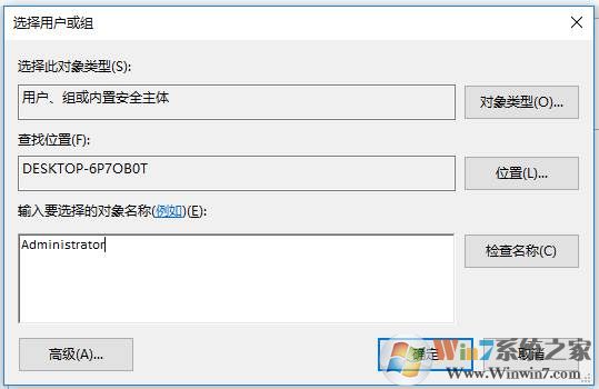 3、在選輸入要選擇的對象名稱里輸入你當(dāng)前登錄的管理員帳戶,如Administrator,也可以點(diǎn)擊高級,然后查找選擇加入;