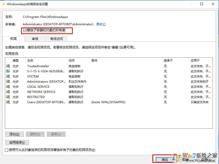 4、確定之后,所有者就變成Administrator了,勾選替換子容器的對象的所有者(表示里面的子文件夾也一并修改),確定