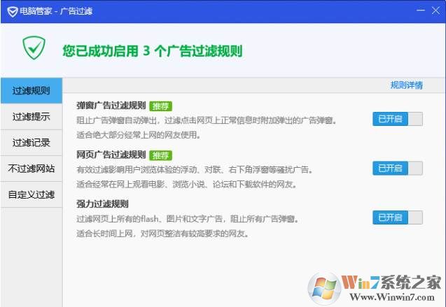 3、打開之后我們開啟各項(xiàng)廣告過(guò)濾規(guī)則,這樣就可以完美的把網(wǎng)頁(yè)廣告給過(guò)濾掉了。