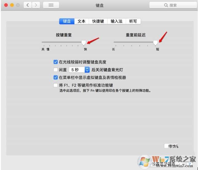3、將【按鍵重復(fù)】及【重復(fù)前延遲】設(shè)置到最高,此時(shí)輸入一串長(zhǎng)長(zhǎng)的文字,長(zhǎng)按delete鍵時(shí)便可連續(xù)刪除了,此時(shí)的delete鍵和Windows電腦的delete長(zhǎng)按刪除功能就一樣了。