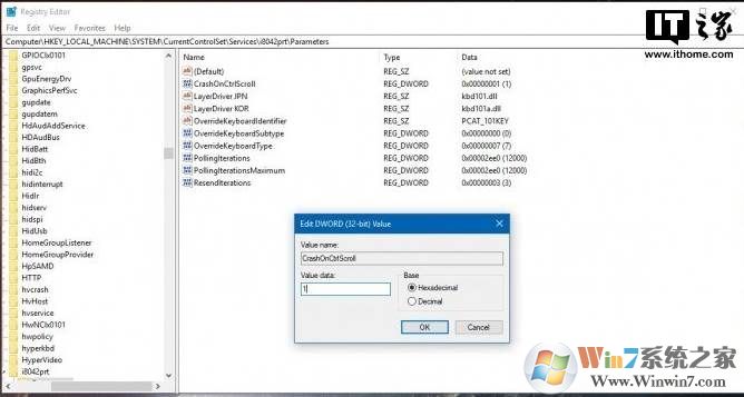 使用regedit命令打開注冊(cè)表,然后定位HKEY_LOCAL_MACHINE\SYSTEM\CurrentControlSet\Services\kbdhid\Parameters,然后在右側(cè)窗口空白區(qū)域點(diǎn)擊右鍵,新建DWORD 32位值,輸入CrashOnCtrlScroll,然后雙擊該條目,將數(shù)值從0改成1。