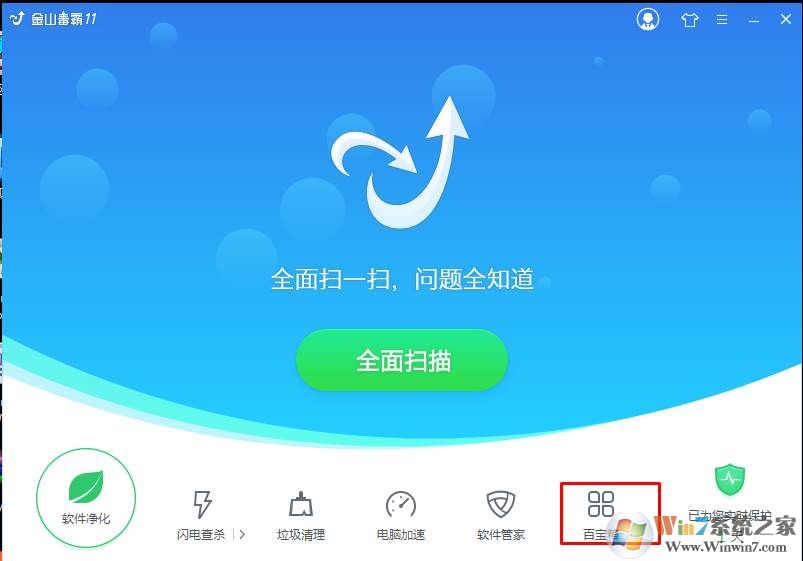 1、打開金山毒霸主界面,點(diǎn)擊百寶箱;如下圖