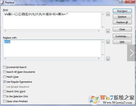 我們現(xiàn)在就需要在每一章標題前面加入#或者##,在emeditor當中按ctrl+h,在尋找欄中填入\s\s第(一|二|三|四|五|六|七|八|九|十|百|(zhì)[0-9])+(章)\s+.*,這是正則表達式的語法,\s表示空格, \s\s表示兩個空格, (一|二|三|四|五|六|七|八|九|十|百|(zhì)[0-9]),表示在第和章之間只要符合(一|二|三|四|五|六|七|八|九|十|百|(zhì)[0-9])里面任一個字符即可,.*表示任意字符,所以\s\s第(一|二|三|四|五|六|七|八|九|十|百|(zhì)[0-9])+(章)\s+.*表示只要以兩個空格開始的第(*)章后面跟空格的任意文字串。