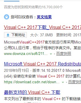 1、參考自己當前所提示的c++版本號進行搜索下載,如,小便這里提示的是c++2017 x64版本的,那么就去網(wǎng)上搜索該版本進行安裝即可。