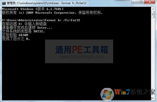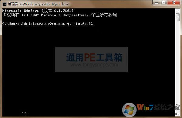 然后在打開的命令窗口中鍵入“format g: /fs:fat32”(注意這里的g是u盤的磁盤盤符),然后回車;