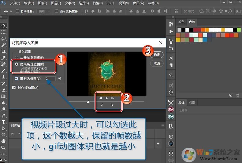 選擇菜單欄的“文件>導(dǎo)入>視頻幀到圖層”,然后在打開的面板中,如下圖所示,同樣是選擇好入點(diǎn)和出點(diǎn),截圖所選視頻片段。PS:如果視頻太長,還可以限制幀數(shù),也是有效減小體積的方法,但是數(shù)不要設(shè)置太大,以免讓動(dòng)作不連貫。