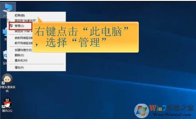 1、右鍵點(diǎn)擊桌面上“此電腦”圖標(biāo),選擇“管理”,打開“計(jì)算機(jī)管理”頁面;