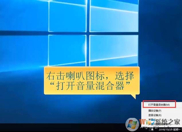 2、鼠標(biāo)右鍵點(diǎn)擊Win10右下方的小喇叭圖標(biāo),選擇“打開音量混合器”;