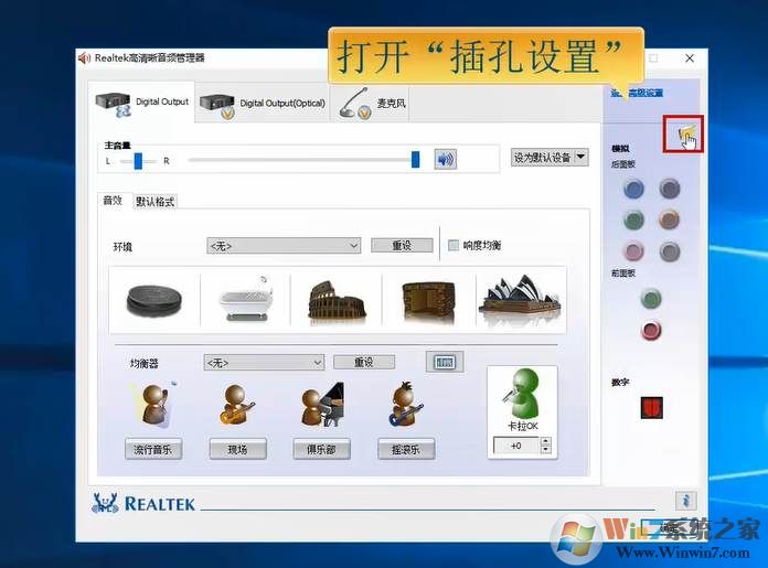 5、然后在面板中打開“插孔設(shè)置”;如下面手指圖標(biāo)所示 。