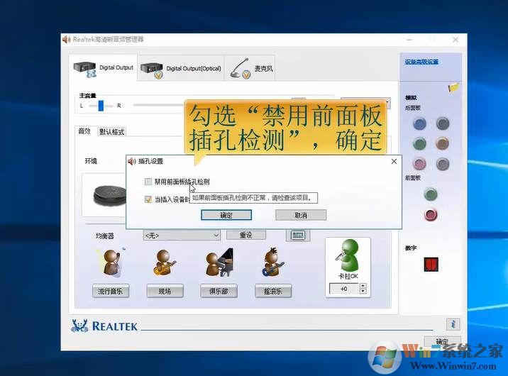 6、在彈出的頁面中,勾選“禁用前面板插孔檢測(cè)”,點(diǎn)擊確定。