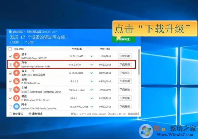 2、在驅(qū)動(dòng)列表中找到聲卡“Realtek High Definition Audio”,選擇“下載升級(jí)”;