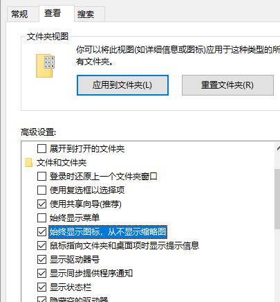 2、點(diǎn)擊“查看”選項(xiàng)卡,查找“高級(jí)設(shè)置”列表下“文件和文件夾”分組中的“始終顯示圖標(biāo),從不顯示縮略圖”選項(xiàng),選中該項(xiàng)并點(diǎn)擊“應(yīng)用”并確定即可。