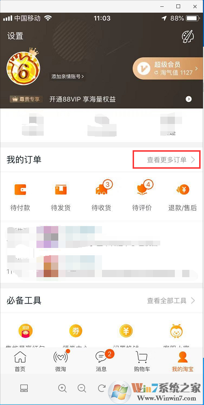 1、打開淘寶,然后點擊我的淘寶,查看更多訂單;