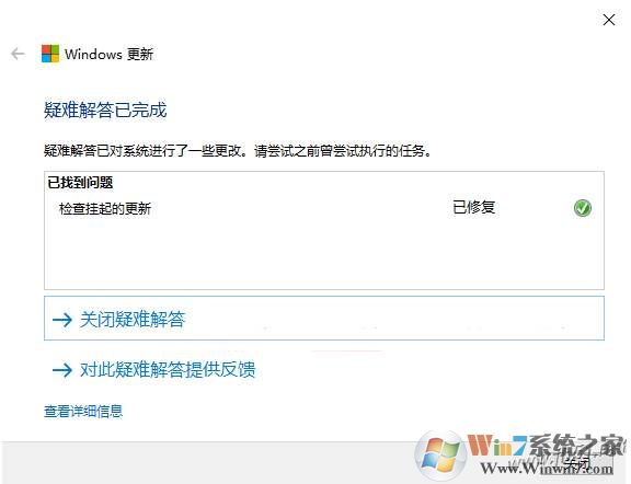 系統(tǒng)被檢測到有掛起的更新。選擇“應用此修補程序”,就會自動下載安裝被掛起的更新。安裝完成后會再次自動檢測,最后提示“疑難解答已完成”,并顯示完成的修復操作。如圖: