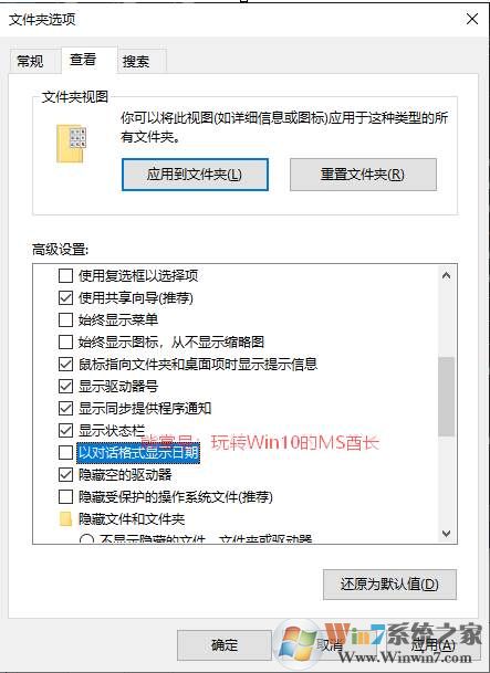 在下面的“高級(jí)設(shè)置”窗格中向下滾動(dòng),在“文件和文件夾”設(shè)置區(qū)域找到“以對(duì)話格式顯示日期”設(shè)置項(xiàng),取消勾選,應(yīng)用或確定。