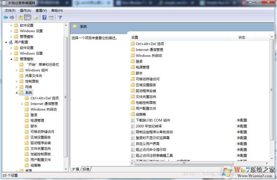 2、這時會打開組策略編輯器,我們依次點擊展開“用戶配置”>“管理模板”>“系統(tǒng)”,然后點擊選中左側(cè)的“系統(tǒng)”;