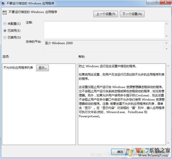 3、 之后在右側(cè)找到“不運行制定的Windows應(yīng)用程序”選項,并雙擊打開設(shè)置;雙擊打開后,先將不運行制定的Windows應(yīng)用程序設(shè)置為“已啟用”選項,并點擊下方的“顯示”按鈕