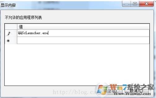 4、點擊顯示后,會彈出如下窗口,然后在“顯示內(nèi)容”窗口,添加要禁用的軟件名稱。,如我們要禁止QQ啟動,那么輸入QQ的啟動程序QQScLauncher.exe,確定即可。cncxm.com win7系統(tǒng)之家