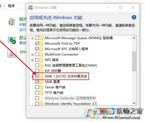 4、找到“SMB1.0/CIFS文件共享支持”勾選起來再確定;