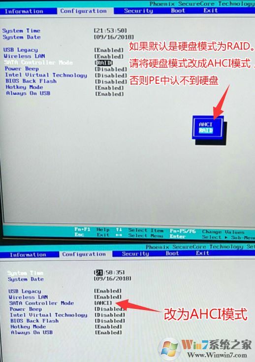 6、注意:再返回configuration這項(xiàng),查看sata controller mode這項(xiàng),如果默認(rèn)硬盤模式為RAID,請將硬盤模式改為AHCI模式,否則進(jìn)PE后不能認(rèn)出硬盤,如果更改后記得按F10保存,如下圖所示;