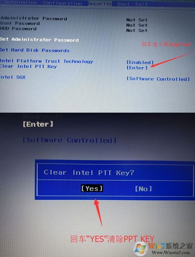 注:按如果Security選項(xiàng)下沒有Secure Boot選項(xiàng),看下是否有"clear intel PTT Key"選項(xiàng),如果有進(jìn)入回車選選擇“yes”清除ppt key,否則無法安裝系統(tǒng)后無法引導(dǎo)啟動(dòng),如下圖所示;