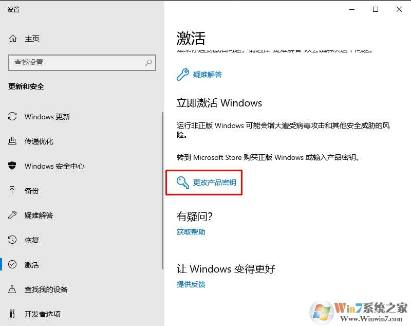 2、然后我們點(diǎn)擊下面的更改產(chǎn)品密鑰或升級(jí)Windows,然轉(zhuǎn)到激活界面,再點(diǎn)擊“更改產(chǎn)品密鑰”;