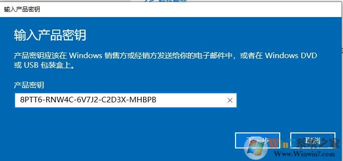 3、在輸入框中輸入:Win10專(zhuān)業(yè)教育版通用用品密鑰:8PTT6-RNW4C-6V7J2-C2D3X-MHBPB