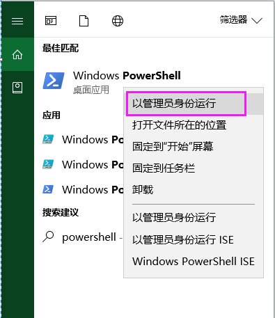 1.打開Cortana搜索欄然后輸入PowerShell,右鍵以管理員身份打開;