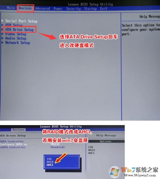 4、切將鍵盤移動Devices選項,把鍵盤移動ATA Drive Setup回車,將configure SATA as中默認(rèn)的raid改成ahci模式,否則安裝win7時會出現(xiàn)0x0000007b藍屏,因為win7中沒有集成raid硬盤驅(qū)動,然后選擇F10保存設(shè)置,在彈出的選項中選擇YES,如下圖所示;