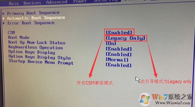 3、切換到Boot,把Boot Mode從UEFI改成Legacy only引導(dǎo)模式,再把csm默認(rèn)disabled改成enabled,開啟兼容模式,選擇F10保存設(shè)置,在彈出的選項中選擇YES;