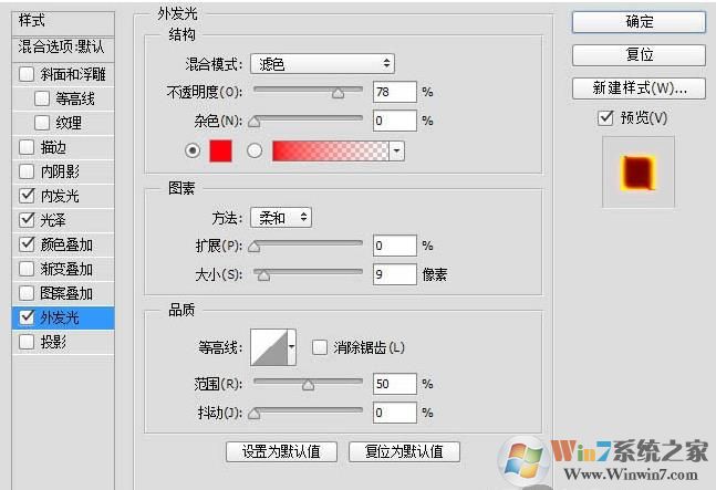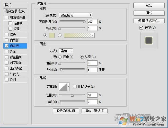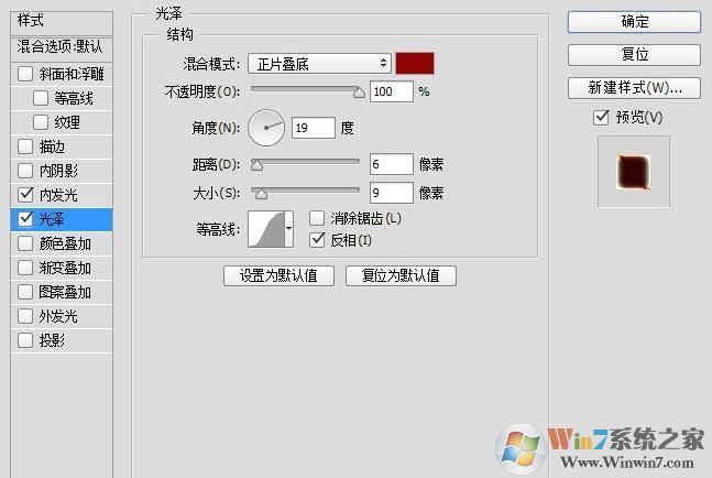 3、這時(shí)我們要開始添加效果了,雙擊線稿圖層,設(shè)置圖層樣式的內(nèi)發(fā)光,光澤,顏色參加,外發(fā)光參數(shù)分別為為如下圖設(shè)置