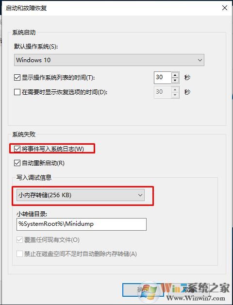 4、勾選將時間寫入系統(tǒng)日志,然后選擇寫入調(diào)試信息,選擇為“小內(nèi)存轉(zhuǎn)存256KB”;