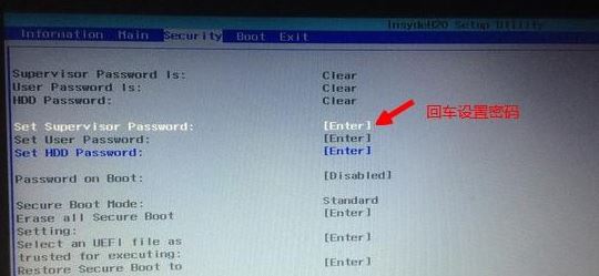 2、如果Secure Boot灰色無法設(shè)置,則轉(zhuǎn)到Security,選擇Set Supervisor Password回車設(shè)置密碼,再返回BOOT選項,將Secure BOOT默認(rèn)enabled為disabled,(注:改完secure boot后再設(shè)置密碼為空即可,要不每次進(jìn)BIOS都要設(shè)置)如下圖所示;
