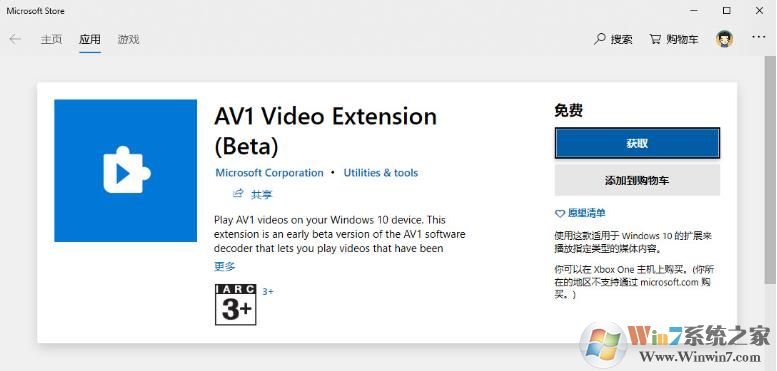 1、打開你的應(yīng)用商店,搜索AV1 Video Extension (Beta) ,就可以看到以下畫面,點(diǎn)擊獲取就可以安裝了。