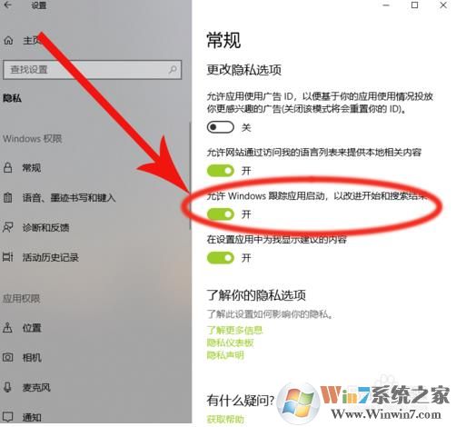 1、返回上一層Windows設(shè)置界面,找到“隱私”選項(xiàng),并打開此選項(xiàng)。找到“允許Windows跟蹤應(yīng)用啟動(dòng),以改進(jìn)開始和搜索結(jié)果”選項(xiàng),并打開此選項(xiàng)。