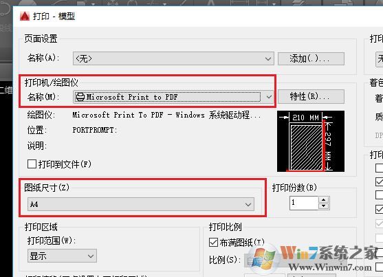3、接著我們?cè)诖蛴≡O(shè)置界面:選擇打印機(jī)的名稱為Microsoft print to PDF,選擇圖紙的大小,如下圖所示: