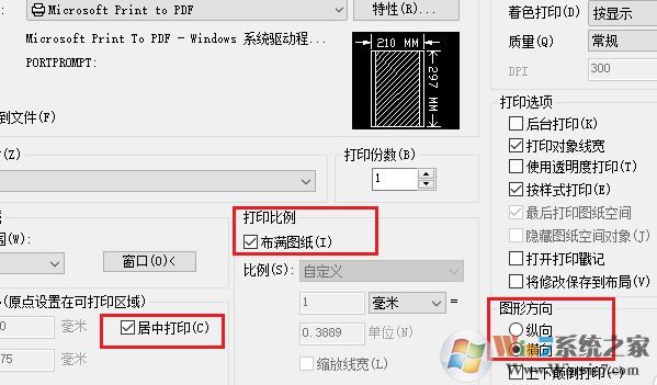 5、選擇居中打印、打印比例為布滿圖紙,按需求選擇圖形方向,如圖: