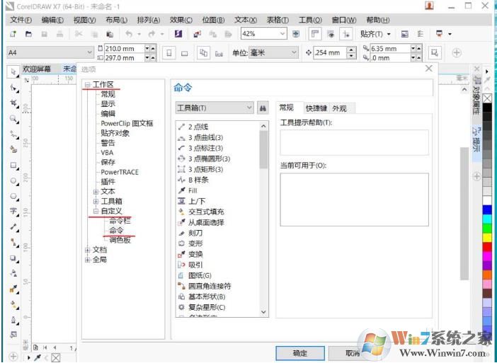 3、然后展開工作區(qū)——自定義——命令,進入設(shè)置界面,如下圖;
