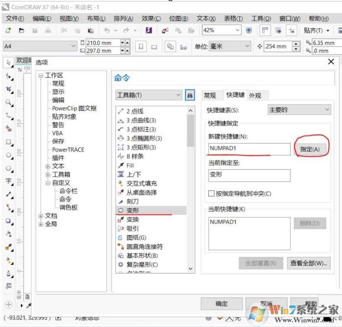 5、這里以變形工具為例,在快捷鍵編輯框輸入數(shù)字鍵盤上的1(數(shù)字鍵盤1),點擊指定;