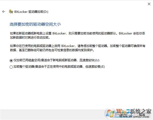 5、選擇要加密的空間大小,可選擇僅加密已經(jīng)使用的磁盤空間,或是加密整個驅(qū)動器;(選擇僅加密已用的磁盤空間是推薦的,加密會比較快,之后新加入的文件會自動加密)