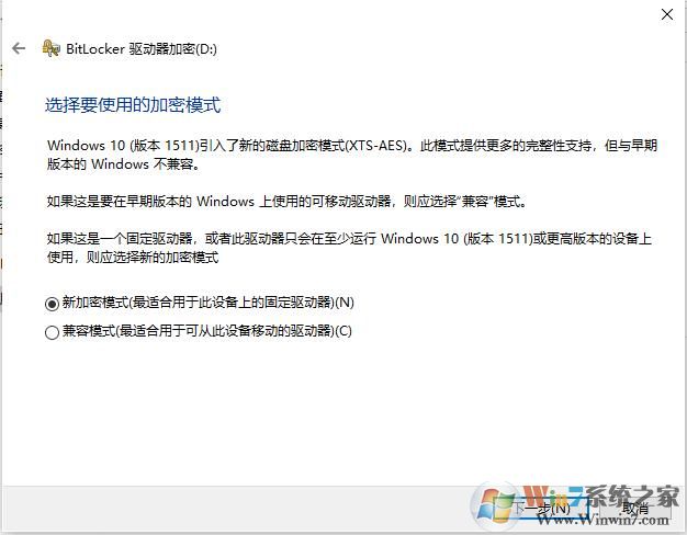 6、選擇加密的模式,有新加密模式和兼容模式,可移動的驅(qū)動器建議兼容模式,本機的話就新加密模式;
