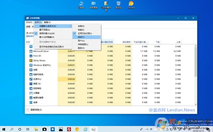 如果你現(xiàn)在命名用的是Windows 10 19H1 Build 18298 等測(cè)試預(yù)覽版,那么可以在打開任務(wù)管理器后點(diǎn)擊頂部的選項(xiàng)按鈕。然后選擇默認(rèn)顯示的界面、如進(jìn)程、性能、應(yīng)用歷史記錄、啟動(dòng)、用戶、服務(wù)等選項(xiàng)。