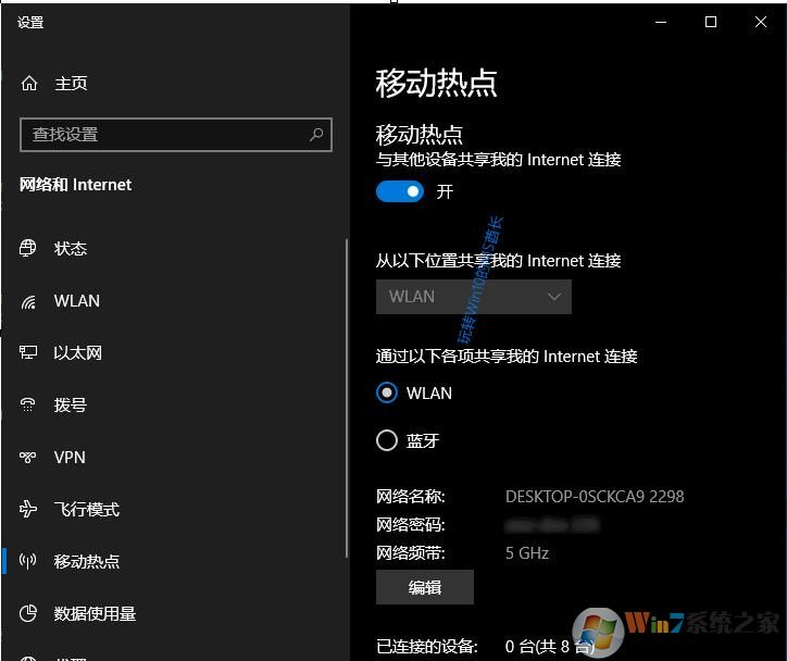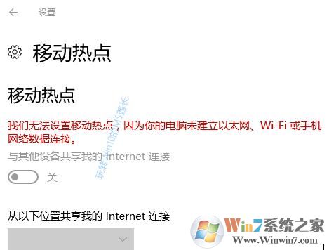 2、這時(shí)候,你再開(kāi)啟Win10電腦的“移動(dòng)熱點(diǎn)”,“從以下位置共享我的Internet連接”選擇“WLAN”,就可以成功開(kāi)啟移動(dòng)熱點(diǎn)了。如圖: