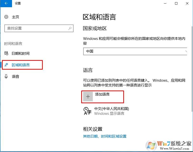 3、之后選擇區(qū)域和語(yǔ)言,并且點(diǎn)擊右側(cè),添加語(yǔ)言;如下圖所示 cncxm.com 整理。