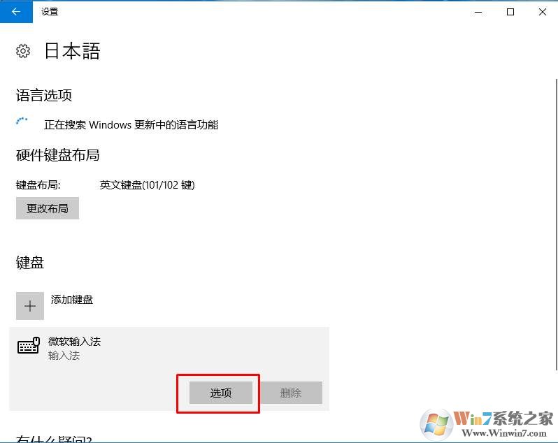 5、稍等一會(huì)就可以添加完成,回到區(qū)域和語(yǔ)言選項(xiàng),點(diǎn)擊日本語(yǔ),然后再點(diǎn)選項(xiàng);如下圖