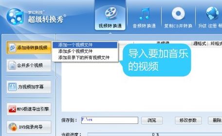 2、下載后進(jìn)行解壓安裝,然后打開超級(jí)轉(zhuǎn)換秀這款軟件,點(diǎn)擊“視頻轉(zhuǎn)換通”選項(xiàng)卡面板左上角的“添加待轉(zhuǎn)換視頻”按鈕,將要加音樂的視頻導(dǎo)入;