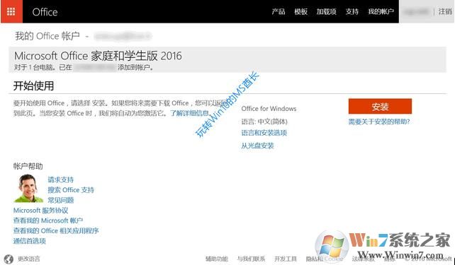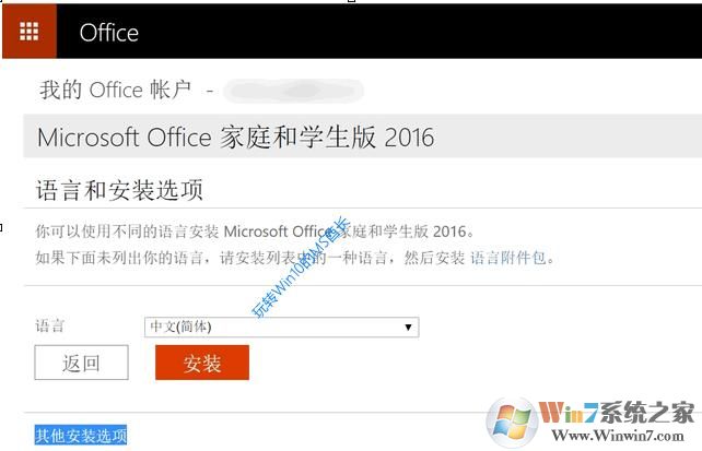 3、這時會出現(xiàn)一個非常亮眼的“安裝”按鈕,這是在線安裝程序,也就是下載后聯(lián)線安裝的。默認(rèn)會下載32位的office,如果你想下載64位的office或者想要下載Office離線安裝程序,則需要點(diǎn)擊“語言和安裝選項”,進(jìn)入如下圖所示界面: