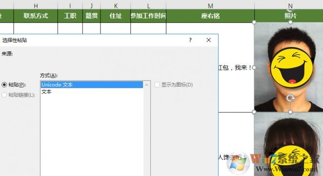 按照上步驟進(jìn)行操作后,照片所在列的行高、列寬調(diào)整好后,復(fù)制記事本中的內(nèi)容,右鍵單擊員工檔案信息表N2單元格,選擇“選擇性粘貼”,在彈出窗口選擇“Unicode文本”,確定后照片就插入到相應(yīng)單元格中了。